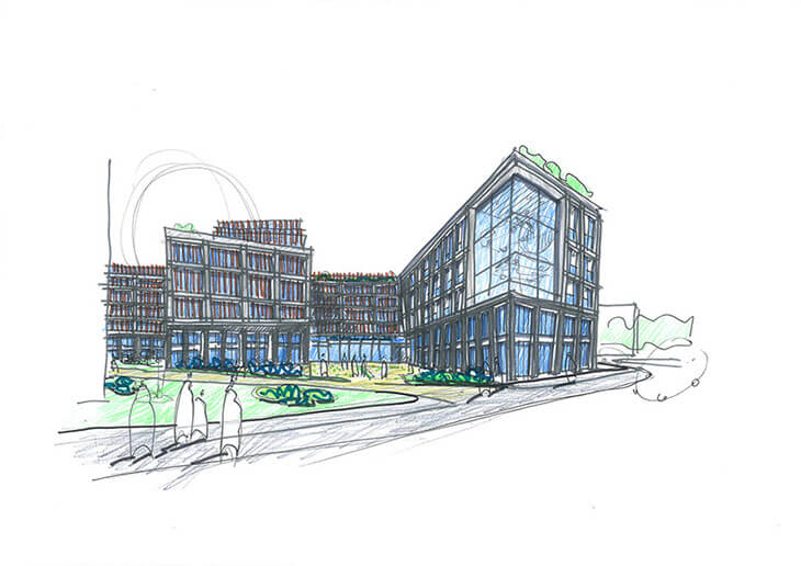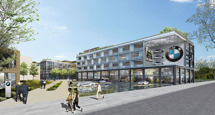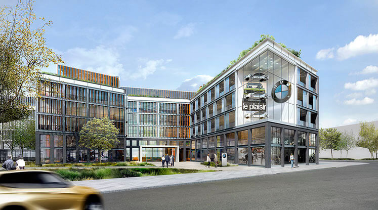 Construction du nouveau campus et workshop de la marque BMW France, 1 projet 3 scénarios. Certification visée NF HQE Bâtiments Tertiaires Passeport (Tertiary Buildings) «Excellent», BREEAM «Excellent», and WELL Core & Shell «Gold».